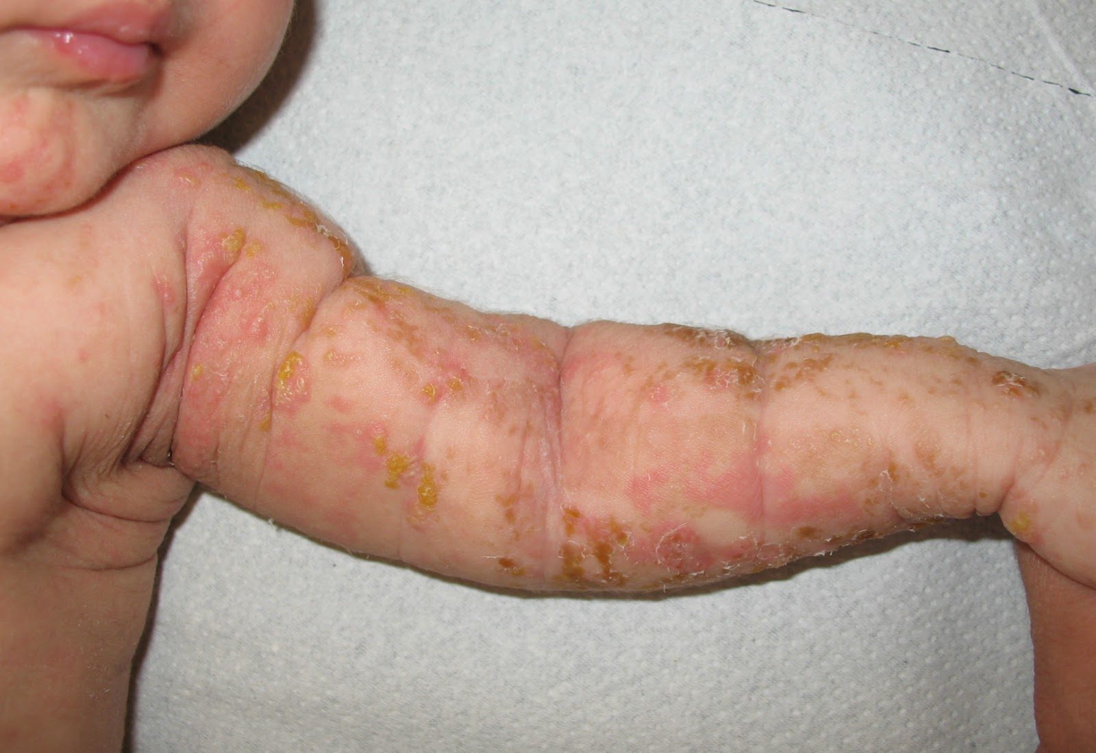 El impétigo es una infección de la piel ocasionada por una bacteria Staphylococcus aureus. Es muy frecuente en niños entre los 2 y 5 años. La bacteria ingresa a la piel a través de pequeños traumatismos previos, como picaduras de insectos o laceraciones en áreas expuestas del rostro y las extremidades. Se producen lesiones ampollares con pus en su interior, cuya ruptura da lugar a la formación de costras gruesas y muy adherentes con apariencia dorada característica. Por lo general, se observa en ambientes cálidos y húmedos. El contacto cercano y la higiene personal deficiente favorece la enfermedad, que se disemina fácilmente en el grupo familiar. Se debe instaurar tratamiento específico para prevenir la diseminación y el contagio.